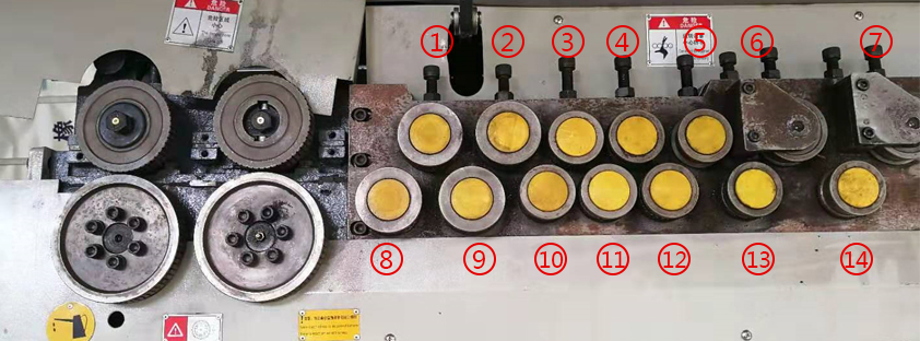 1、将活动矫直轮1、2、3、4按由紧至松压下。