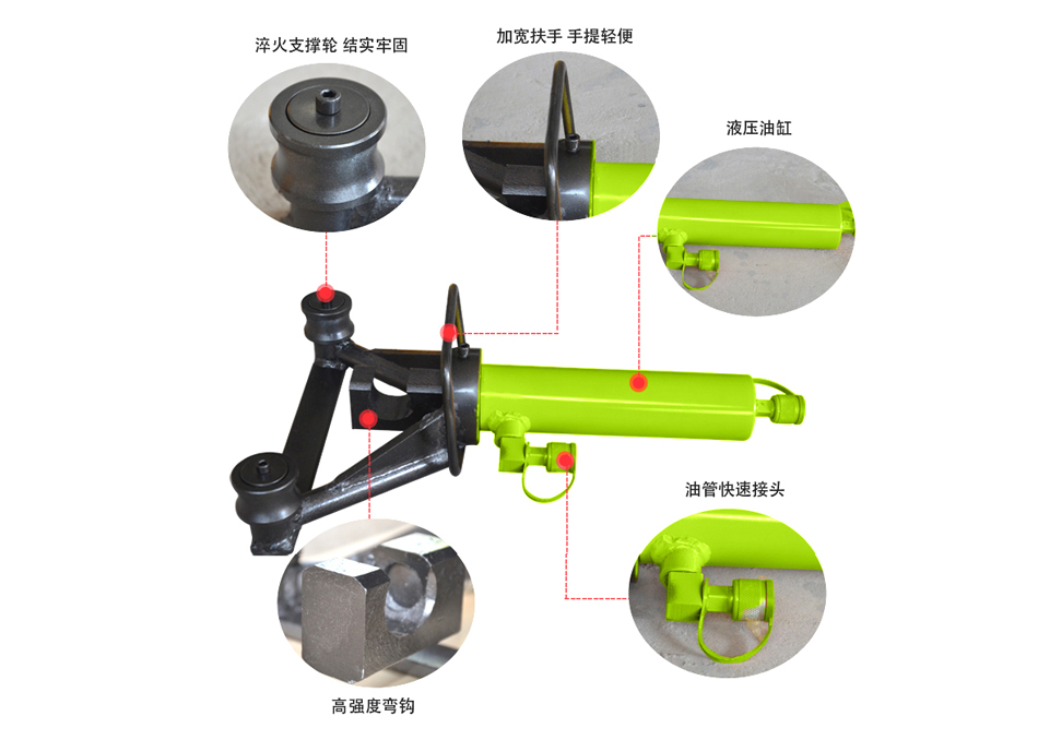 1、本手提工具轻便灵活,适合钢筋绑扎后普通弯曲机难以达到之部位等工地现场作业; 2、采用高油压系统驱动,弯曲力大,调直弯曲最大可32MM钢筋;